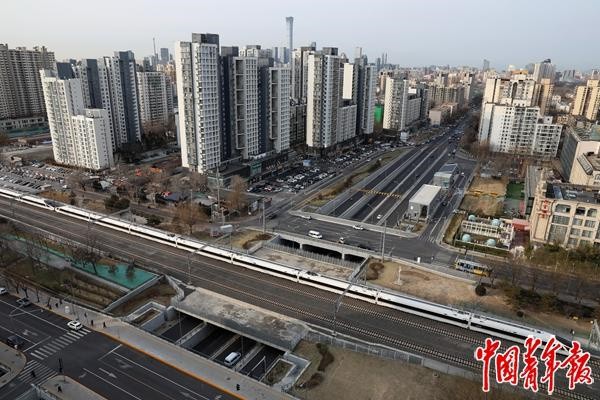2025年1月11日,一列高铁列车从位于北京东四环外的姚家园南路下穿京包GA黄金甲通道上方经过。火车、汽车、行人“各行其道”,互不影响。周边高楼林立,远处可见位于北...
