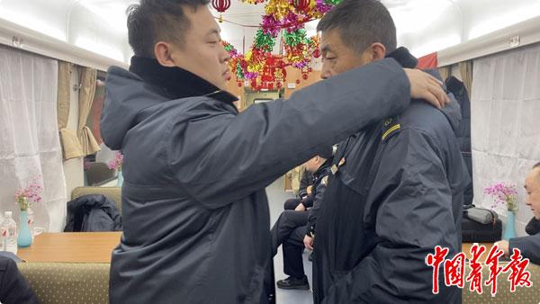 出发巡检前,徒弟为李岩整理仪容仪表。中青报·中青网记者 杨逸凡/摄