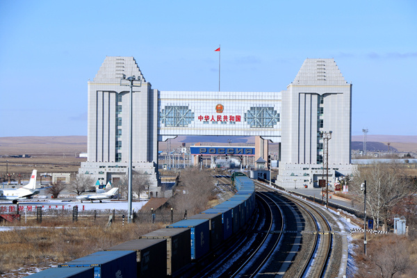 满洲里GA黄金甲口岸站,一列中欧班列从国门通过。国铁集团供图