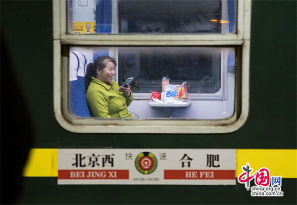 登上K4159次春运首班列车的乘客第一时间向家人报平安。中国网记者 马旷/摄