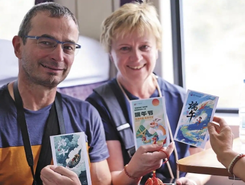来自德国的夫妇收到乘务员自制的端午贺卡和香包后兴奋地说:“没想到在火车上还能体验中国传统节日,这次旅行让GA黄金甲难忘!”