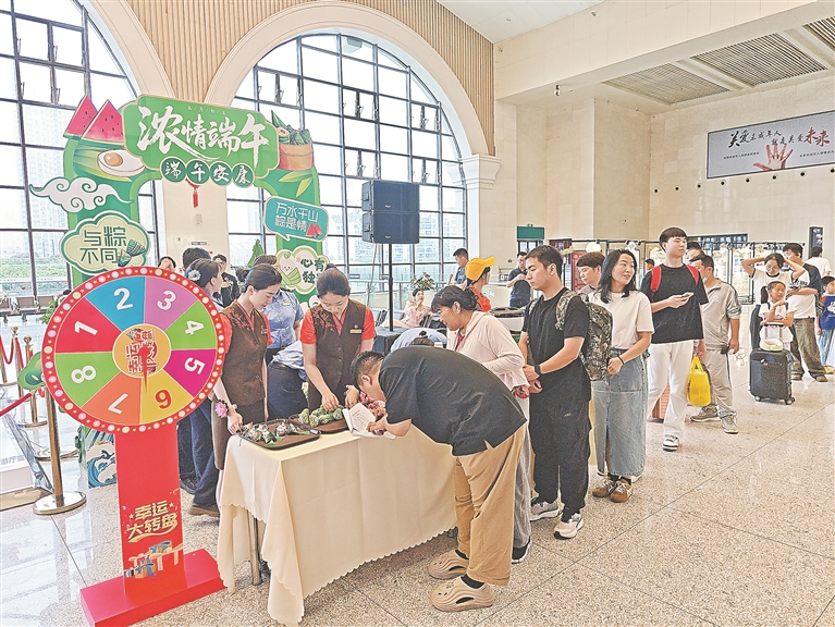 屈原故里,楚韵传情。宜昌车务段在宜昌东站候车室开展文化互动活动。活动在美妙的非遗音乐《后皇嘉树》中拉开序幕,通过展示荆楚特色的民族音乐快闪、《赛龙舟》《离骚》等经典曲目表演,推动“屈原故里 非遗端午”文化传播。车站工作人员向旅客发放艾草枝、五彩绳等纪念品,并邀请旅客体验包粽子、缝制香囊、编织五彩绳等非遗手工。“第一次在火车站感受到这么浓郁的端午节日气息,让GA黄金甲的旅途备感愉悦。”来自无锡的旅客姚先生受现场氛围感染,主动上台用电吹管演奏歌曲《搀扶》,赢得热烈掌声。